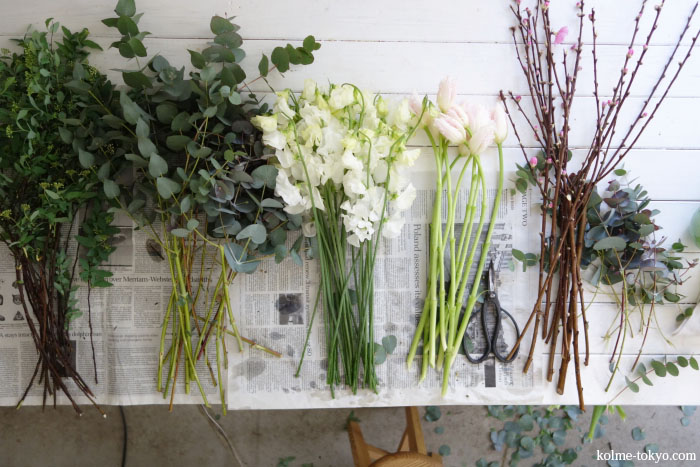 - モモの枝は他の花やグリーンよりも長めに用意しておきます。