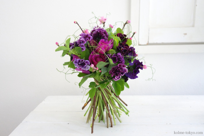 特に長い枝を2~3本飛び出させると、メリハリの効いた動きあるワイルドなブーケになります。