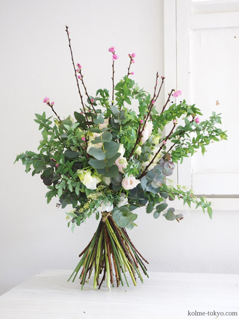 ・長い枝でブーケにワイルドなアクセントをつける。
