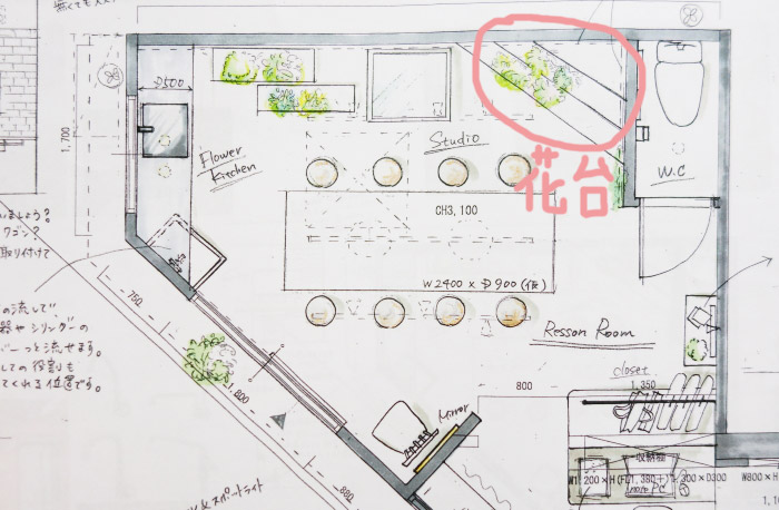 ここに花材が並べてお花屋さんっらしくなる予定です。