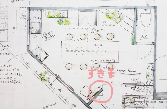 KOLMEアトリエリニューアル工事は続行中!今週はこんな感じになりました。入口らしくなってきた枠ができるとぐっと入口らしくなりますね。ここにはガラスと扉がはめ込まれます。赤い枠の色もポップですてきですね。入口の仕上がりは違う色になります。花台の設置階段状の花台ができましたよ。ここに花材が並べてお花屋さんっらしくなる予定です。完成図のピンクの部分です。ボードがつけられて個室感UPサッシの周りもコンクリートで壁らしく。塗料の香りただよう現場事務スペース先週は断熱材むきだしだった壁に石膏ボードが貼られて部...