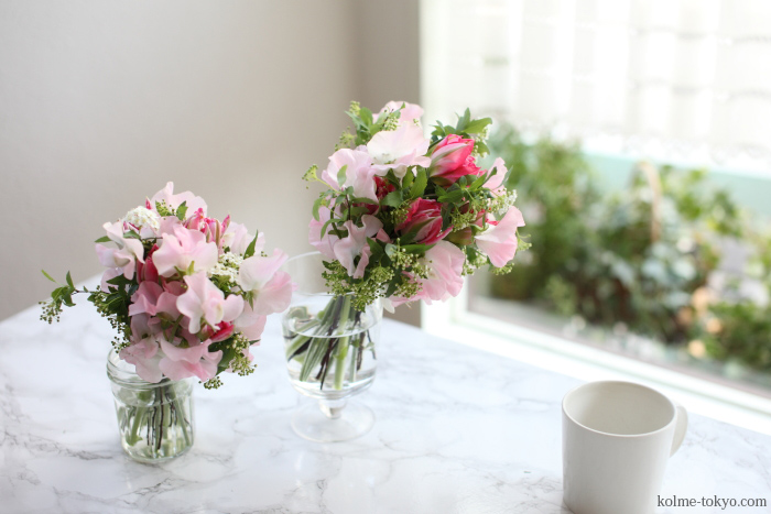 手のひらサイズのプチブーケはダイニングテーブルやリビングルームにさり気なくなじみ、